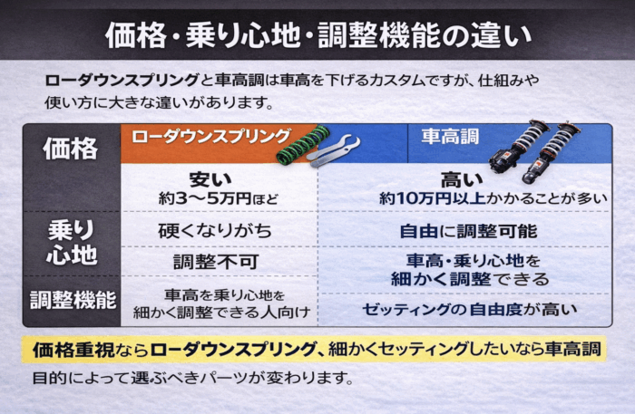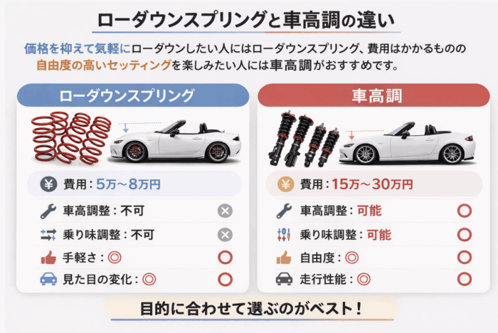 ローダウンスプリングと車高調は、どちらも車高を下げるカスタムですが、仕組みや使い方には大きな違いがあります。