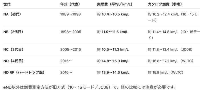 歴代のロードスターで比べても、カタログ燃費ベースでNDロードスターが最も燃費が良いので、相対的に燃費は良いといえます。