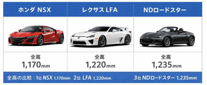 ホンダNSX・レクサスLFAに次ぐ3位の低さです。